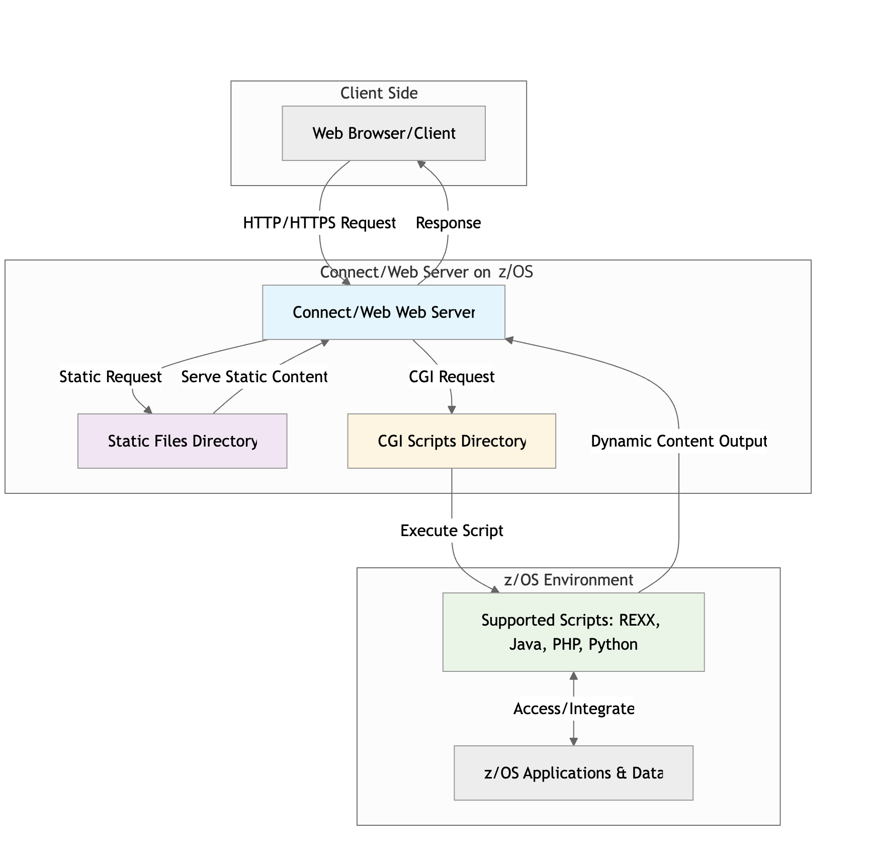 Connect/Web runs natively on z/OS, requiring minimal configuration and no external servers or third-party dependencies. Developers can deploy scripts by simply placing them in designated directories, streamlining setup and reducing operational overhead.